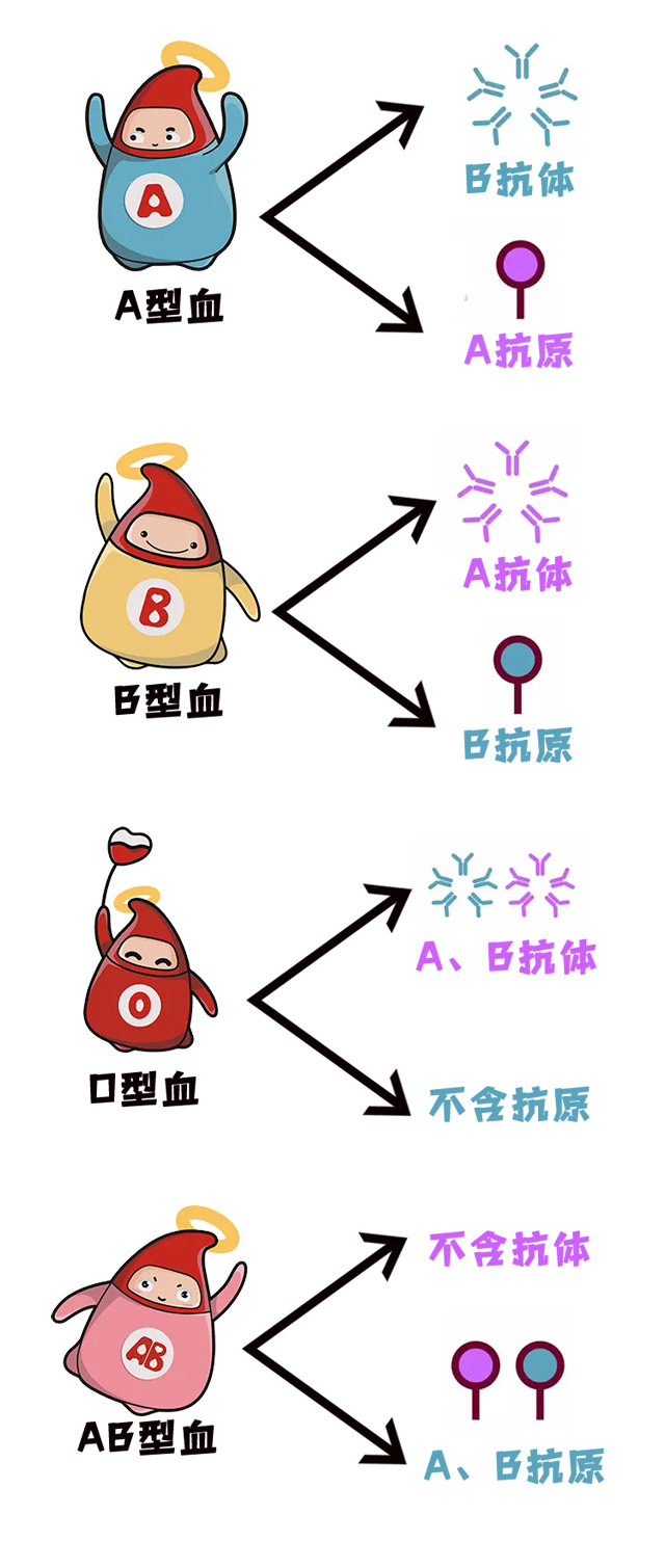 AB型血,不含抗體,A.B抗原